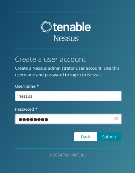 To access Nessus navigate to https://localhost:8834. Once we arrive at the setup page, we should select Nessus Essentials for the free version, and then we can enter our activation code. Then set up a username and password.